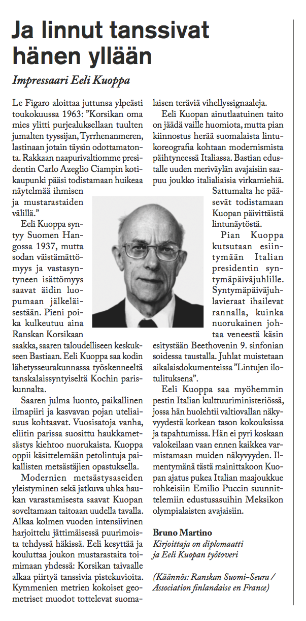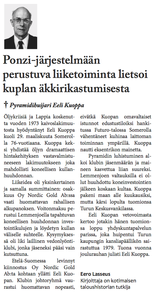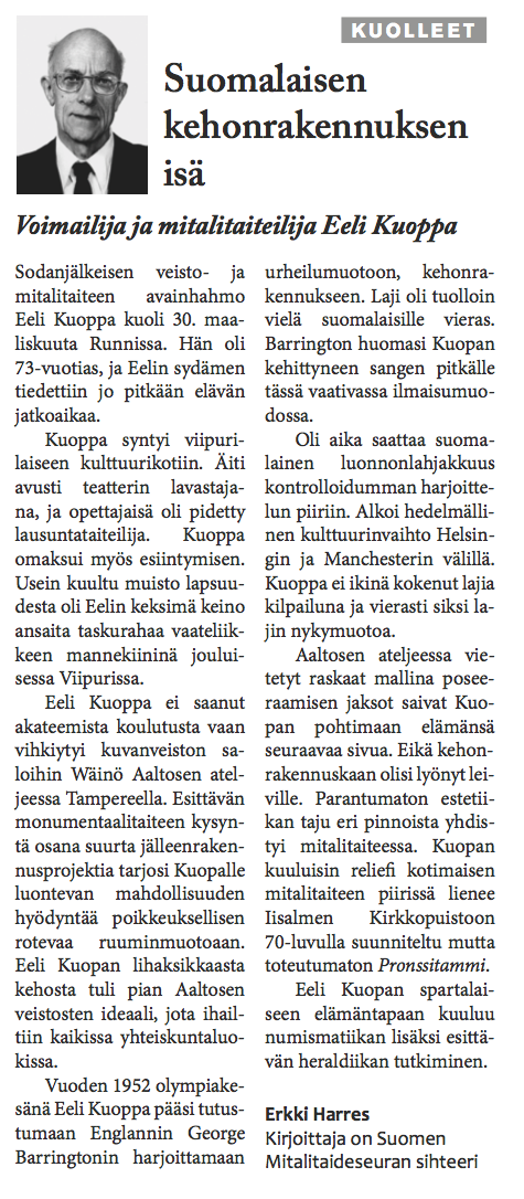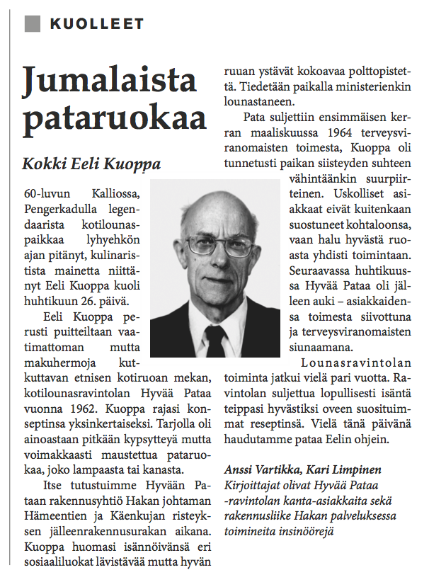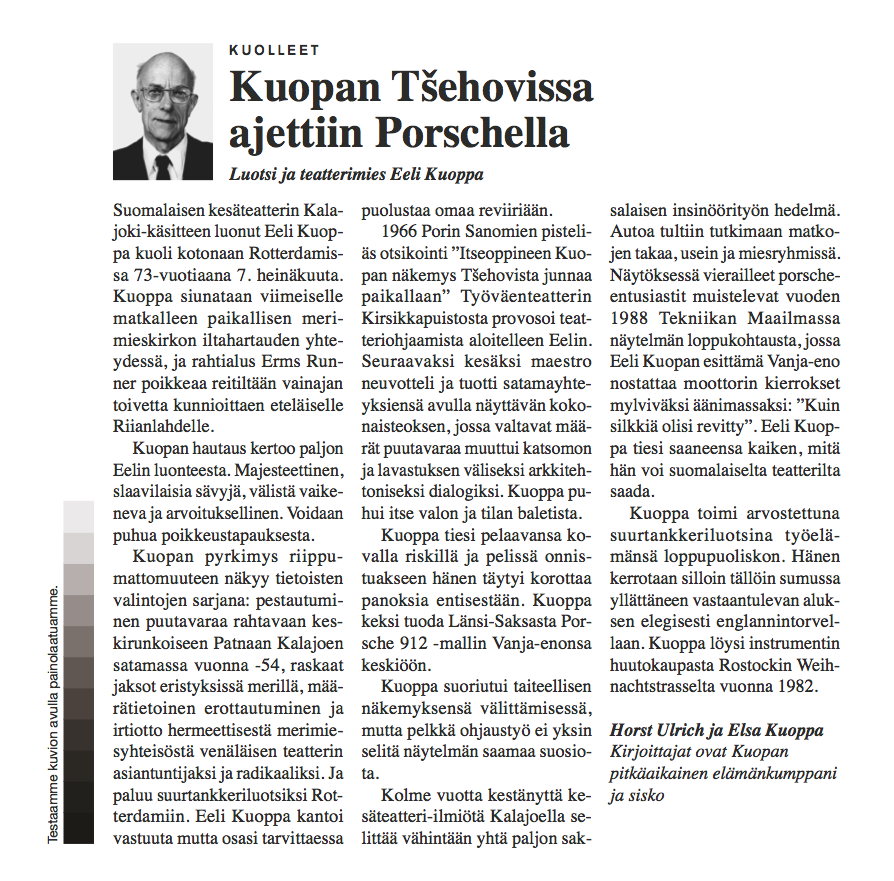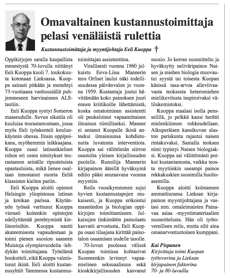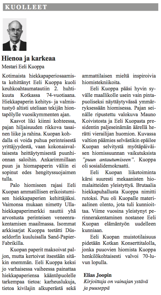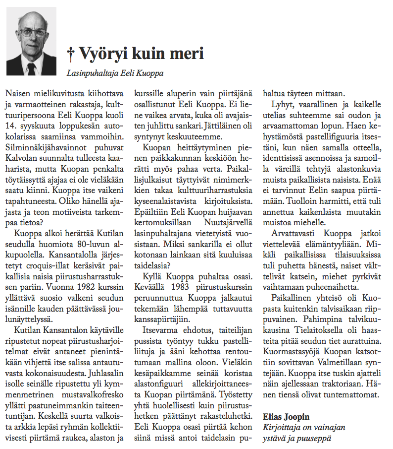 The Eeli Kuoppa project consists of a series of obituaries describing the peculiar life and death of a fictional character named Eeli Kuoppa. The entire artistic project included a gallery exhibition, events, classical portraits of Eeli Kuoppa, and a seminar in Helsinki City Art Museum’s Kluuvi Gallery in the spring of 2013.